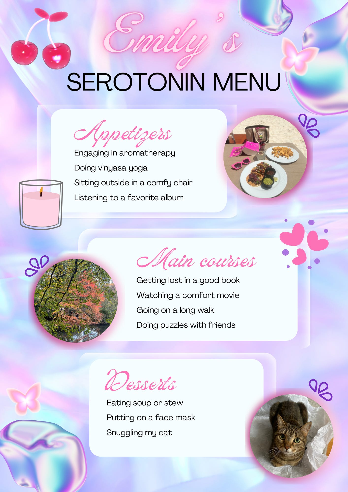 I’ve seen other people on Substack and Instagram make what’s called a “dopamine menu,” AKA: listing a bunch of activities that give a rush of dopamine. I decided to take that concept but make a serotonin menu instead. Dopamine is fun and all, but it’s more high key. I’m trying to keep things low key these days, you know?